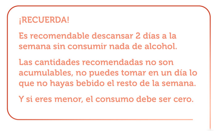 Estas recomendaciones son de carácter orientativo, ya que la ingesta de bebidas alcohólicas no afecta por igual a todas las personas. Influyen diversos factores como el peso, el sexo, la edad, el consumo previo de alimentos, la forma en que se produce dicho consumo, etc. Estas recomendaciones no pueden aplicarse a los denominados colectivos de riesgo: menores, conductores y embarazadas. Tampoco son aplicables en las personas con determinadas afecciones que pueden verse agravadas por el consumo de bebidas alcohólicas (por ejemplo, hipertensión), aquellas que toman medicamentos no compatibles con el alcohol. Así como tampoco son compatibles con la realización de actividades tales como la conducción de vehículos o la manipulación de maquinaria. En esos casos el consumo responsable, es el consumo cero. El Ministerio de Sanidad señala que un consumo de riesgo sería aquel que supere los 20 o 25 gramos de alcohol puro en el caso de las mujeres y los 40 gramos de alcohol puro en el de los hombres. Estas recomendaciones son de carácter orientativo, ya que la ingesta de bebidas alcohólicas no afecta por igual a todas las personas. Fuente*: Puedes consultar la página del Ministerio pinchando aquí.