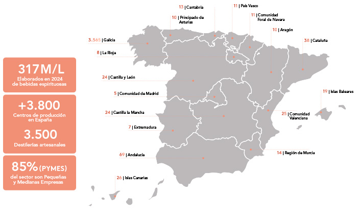 En 2024 se elaboraron 317 millones de litros de bebidas espirituosas de los cuales 137 millones de litros se destinaron a la exportación. A nivel internacional España es el 6º país productor de bebidas espirituosas en la UE. El sector de las bebidas espirituosas cuenta con una amplia tradición 52 en España, siendo un país productor y con unas características de consumo responsable. La industria de las bebidas espirituosas tiene presencia en todo el territorio nacional, destacando Andalucía, Cataluña, Galicia, Castilla-La Mancha, Navarra, Murcia y La Rioja por su importancia en términos relativos.